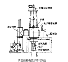 以真空自耗電弧爐為例說明如下。成套設備由爐體、水冷銅坩堝、真空機組、光學觀察裝置、控制系統(tǒng)、直流電源等部分組成,